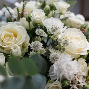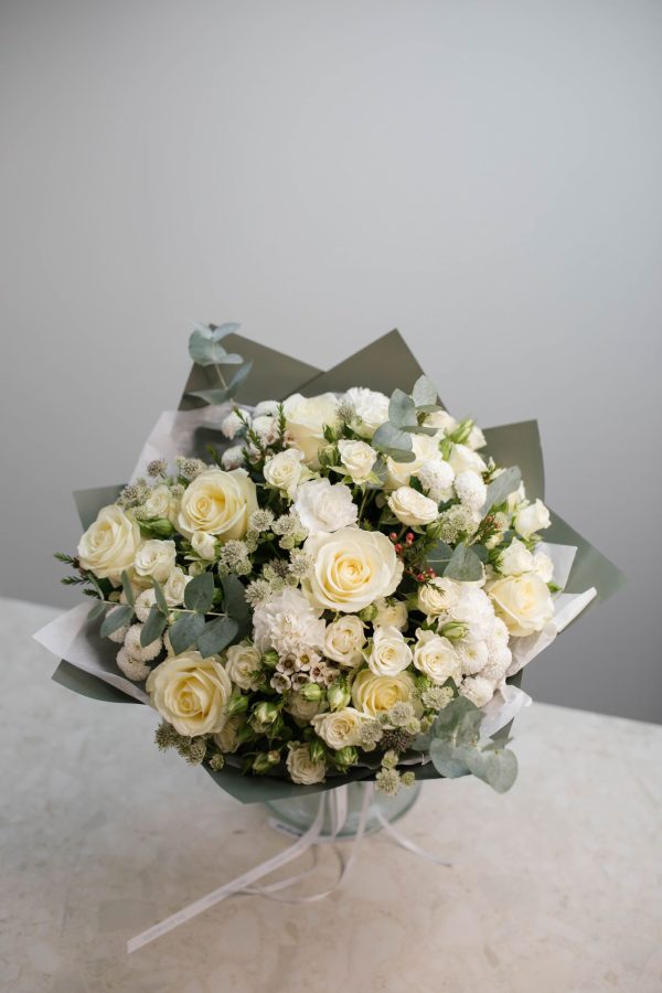 The Elegance bouquet is a refined arrangement of white roses, spray roses, waxflowers, astrantia star, white carnations, and chrysanthemums, delicately accented with fresh greenery and eucalyptus. Perfect for celebrating life’s graceful moments, this bouquet embodies purity and sophistication.